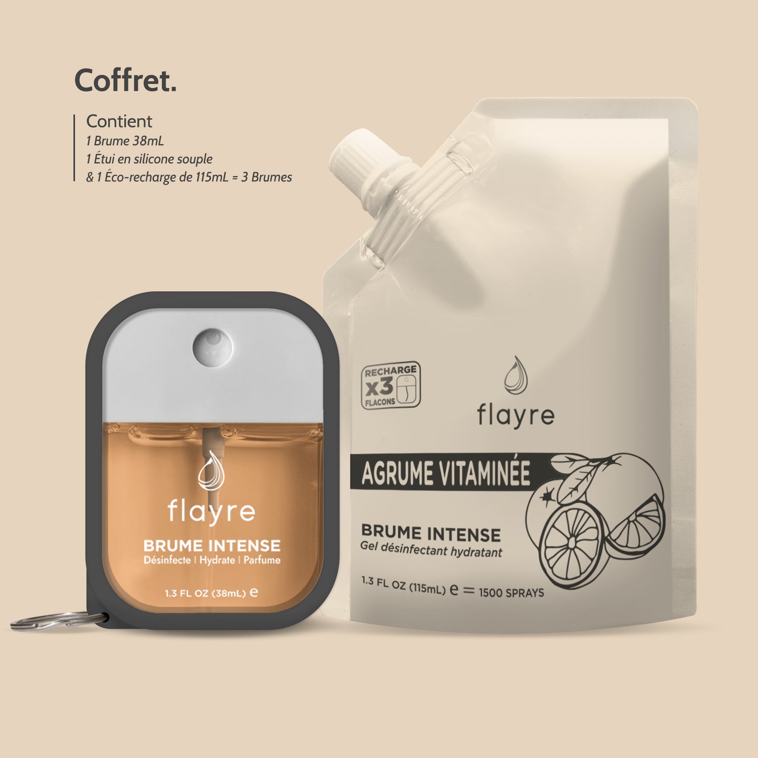 Notre coffret vous permet de choisir : Un flacon de la senteur de votre choix + une recharge de 115mL + un étui en silicone type porte-clés.